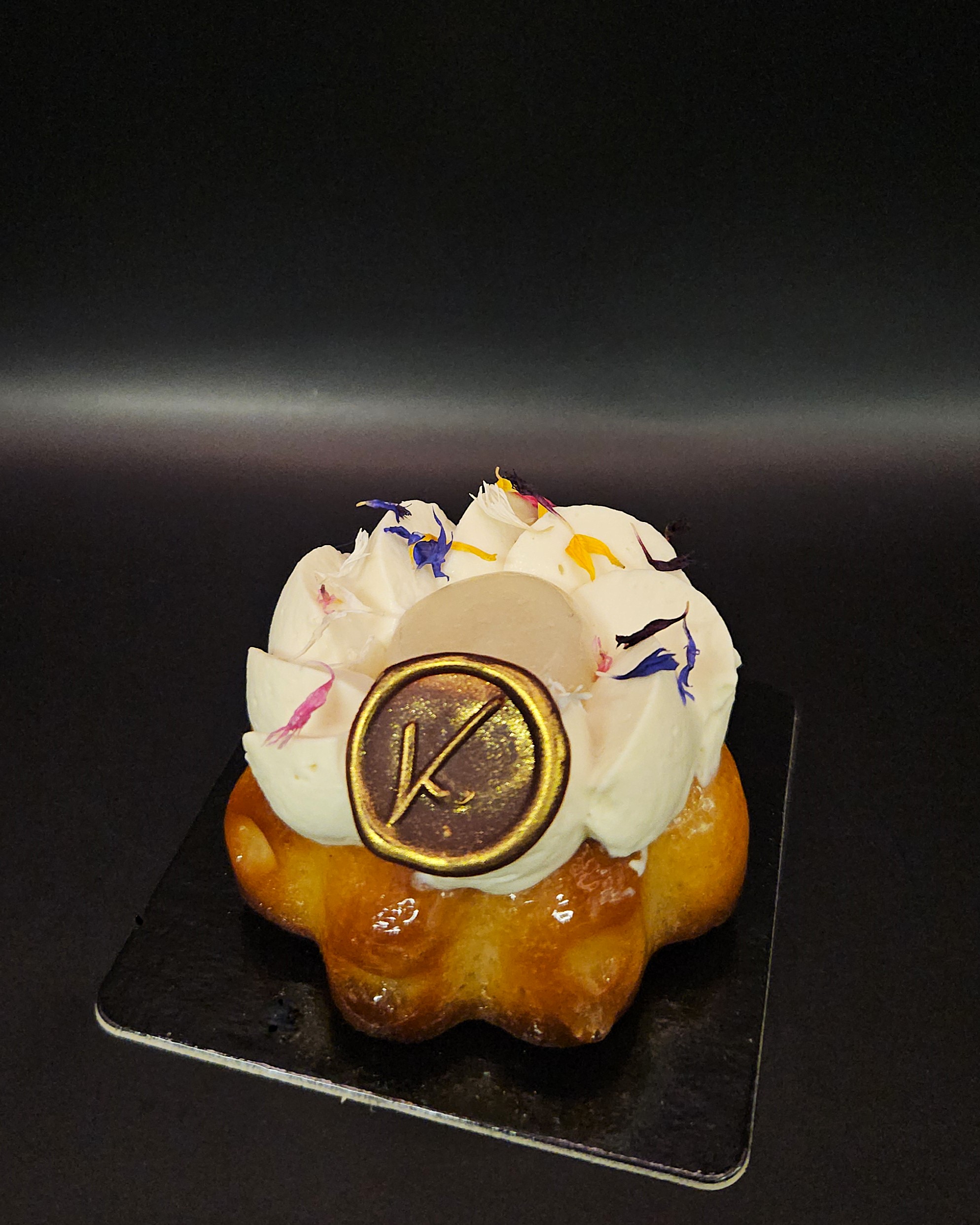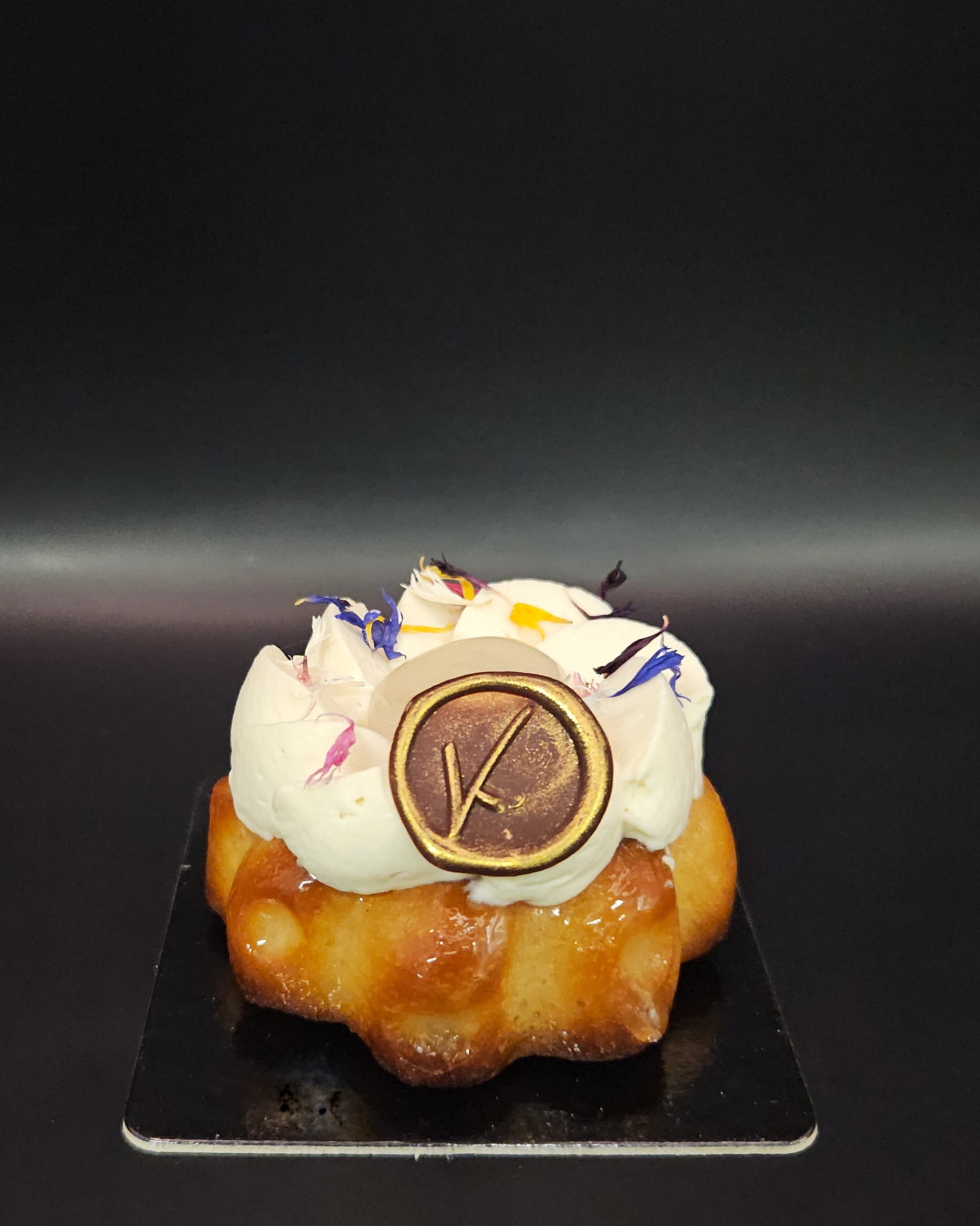 Biscuit savarin maison au thé des elfes, Gel de jus de Koa (fruit du cacao), Délicate crème infusion thé vert et fleurs.