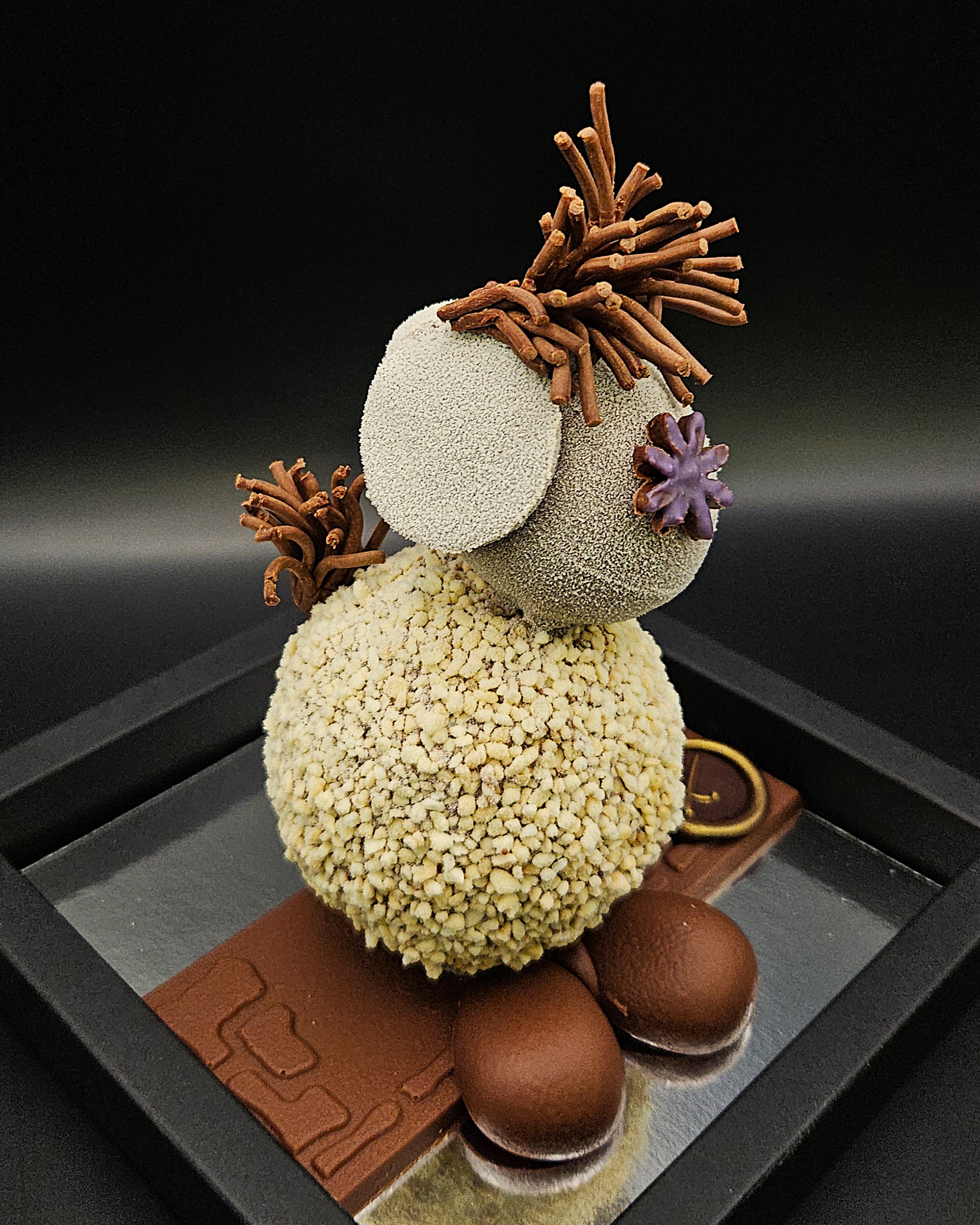Ingrédients : Sucre, fèves de cacao, beurre de cacao, LAIT en poudre, vanille* Madagascar,  Teneur en cacao min. 40%,  NOISETTE, AMANDE, BEURRE, émulsifiant : lécithine de tournesol, Colorants 100% naturels : spiruline, radis, cassis et pomme, curcumine, argent, Or, oxide de fer, carbonate de calcium