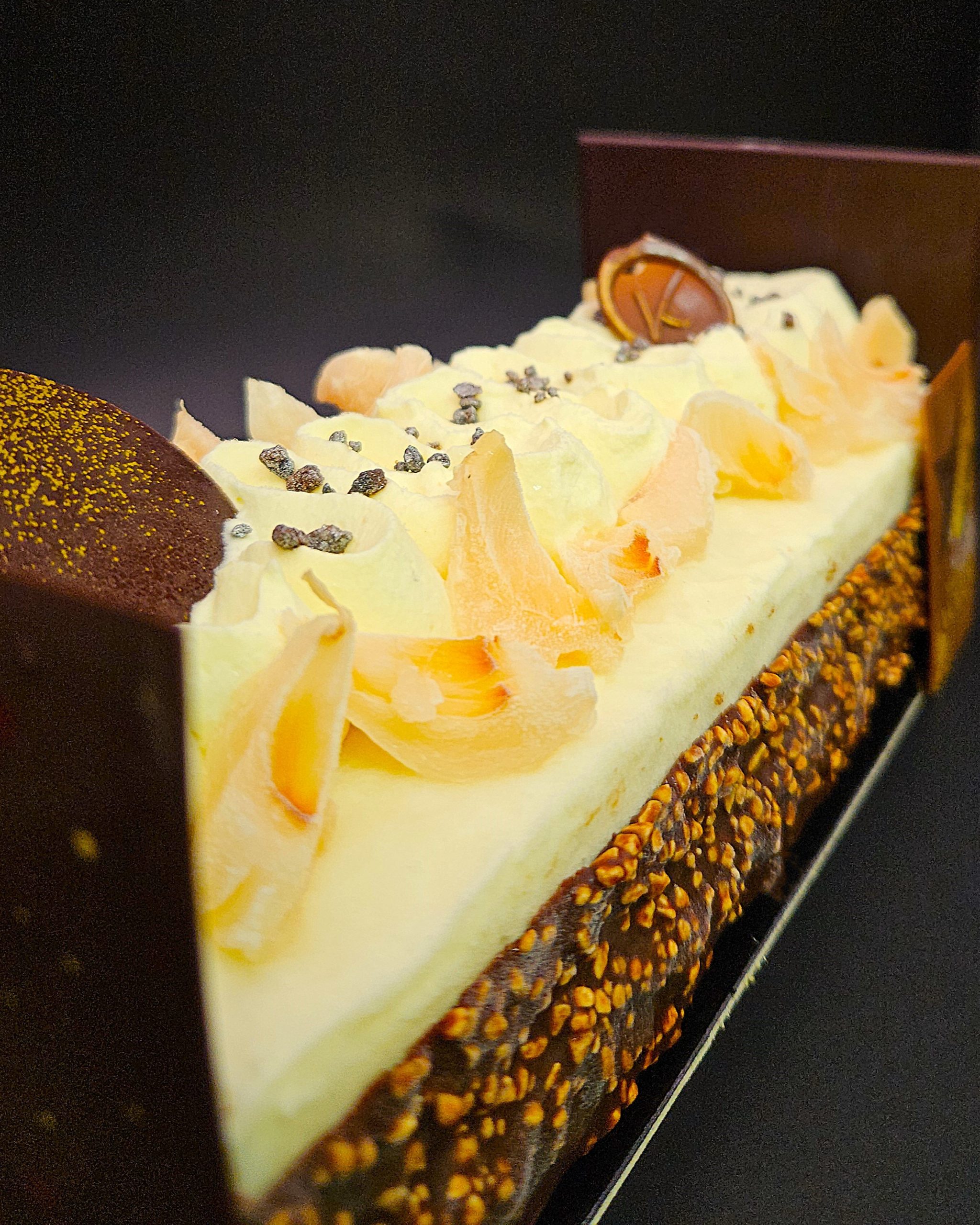 Une compotée généreuse d’airelles, un biscuit moelleux sans farine au sésame et un croustillant praliné , sublimés par une crème légère et mousseuse au sésame noir.