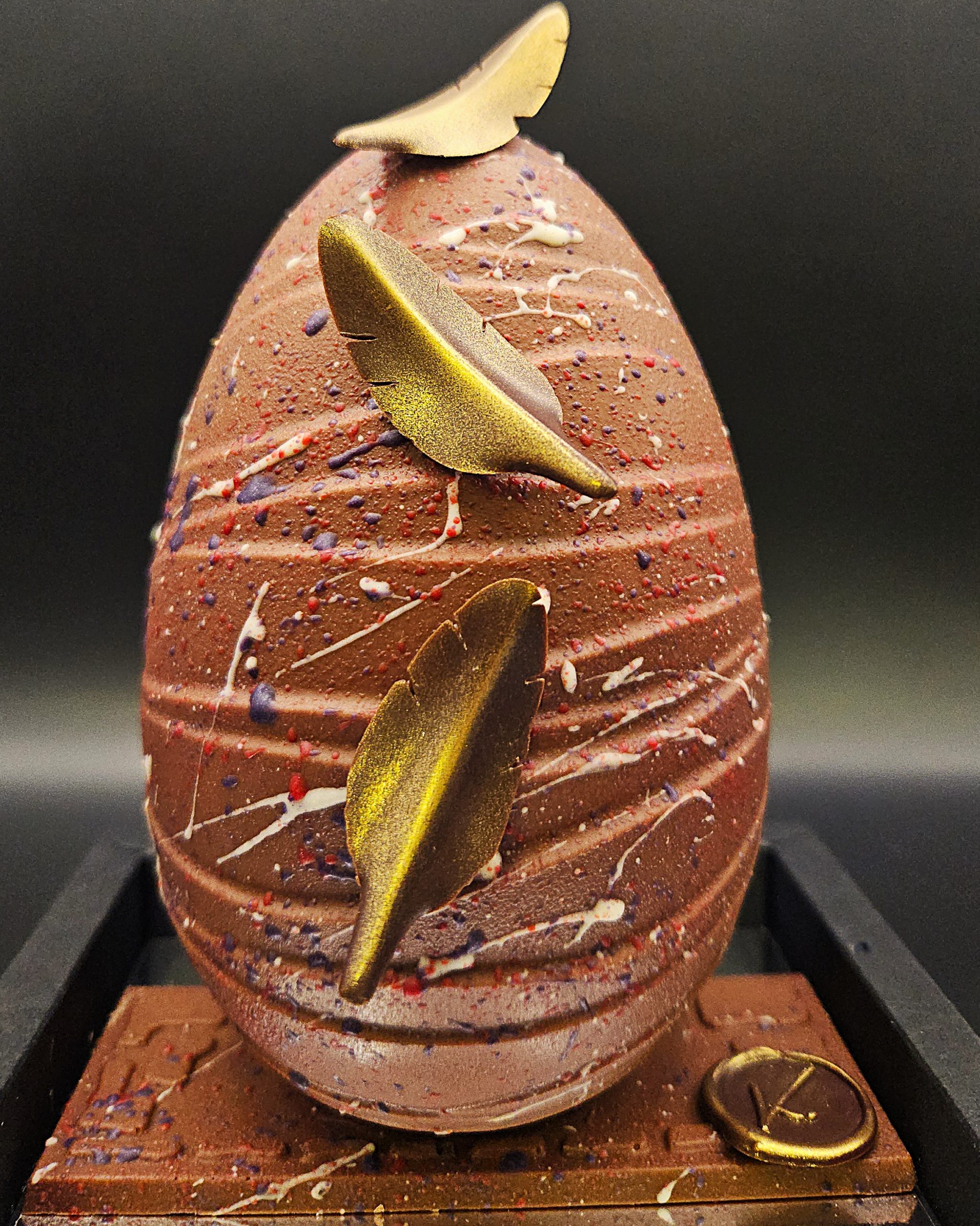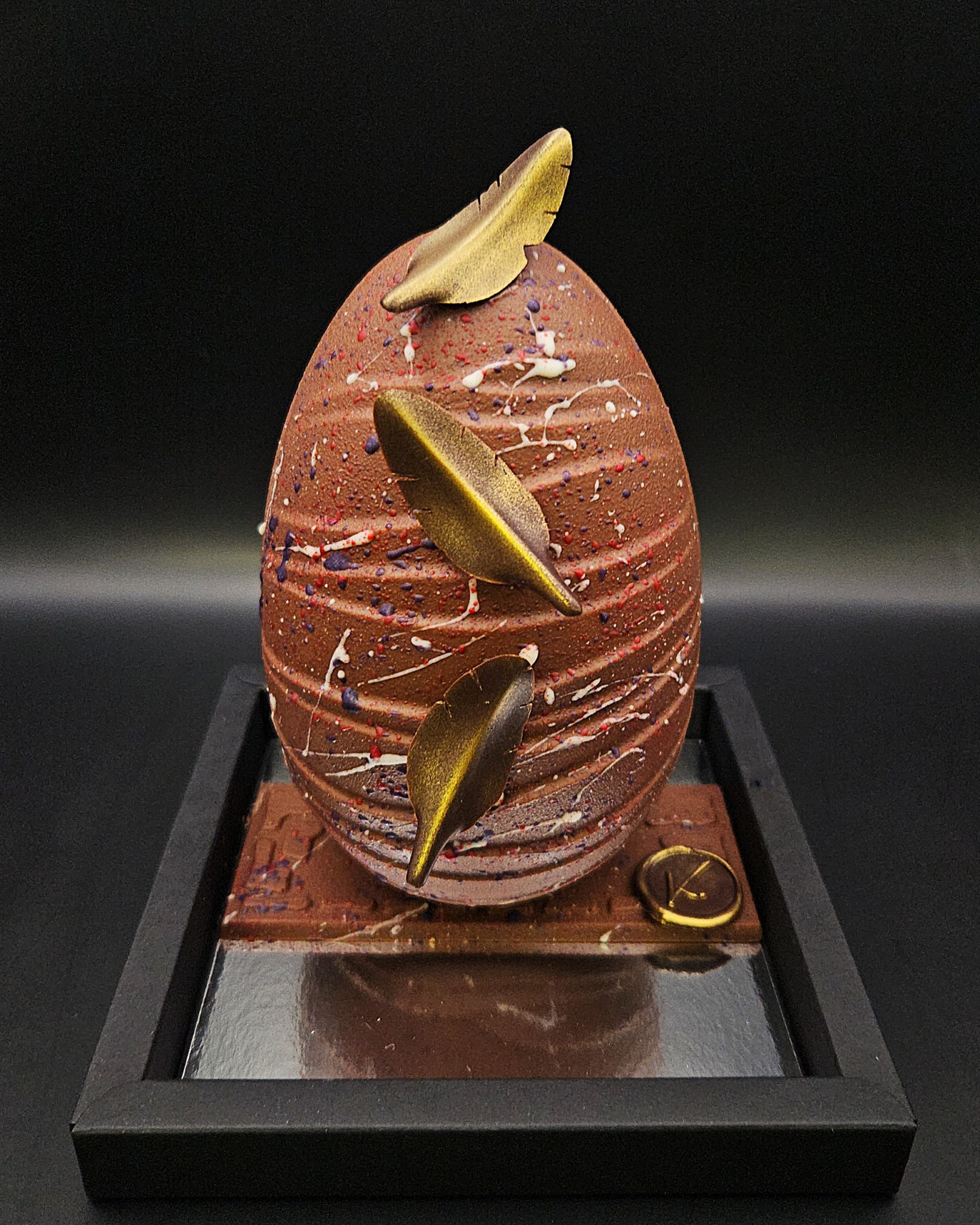 Élaboré en chocolat Grand Cru Lait, cet œuf gourmand séduit par sa coque au croustillant de macadamia et riz soufflé, une alliance délicate entre fondant et texture légère.