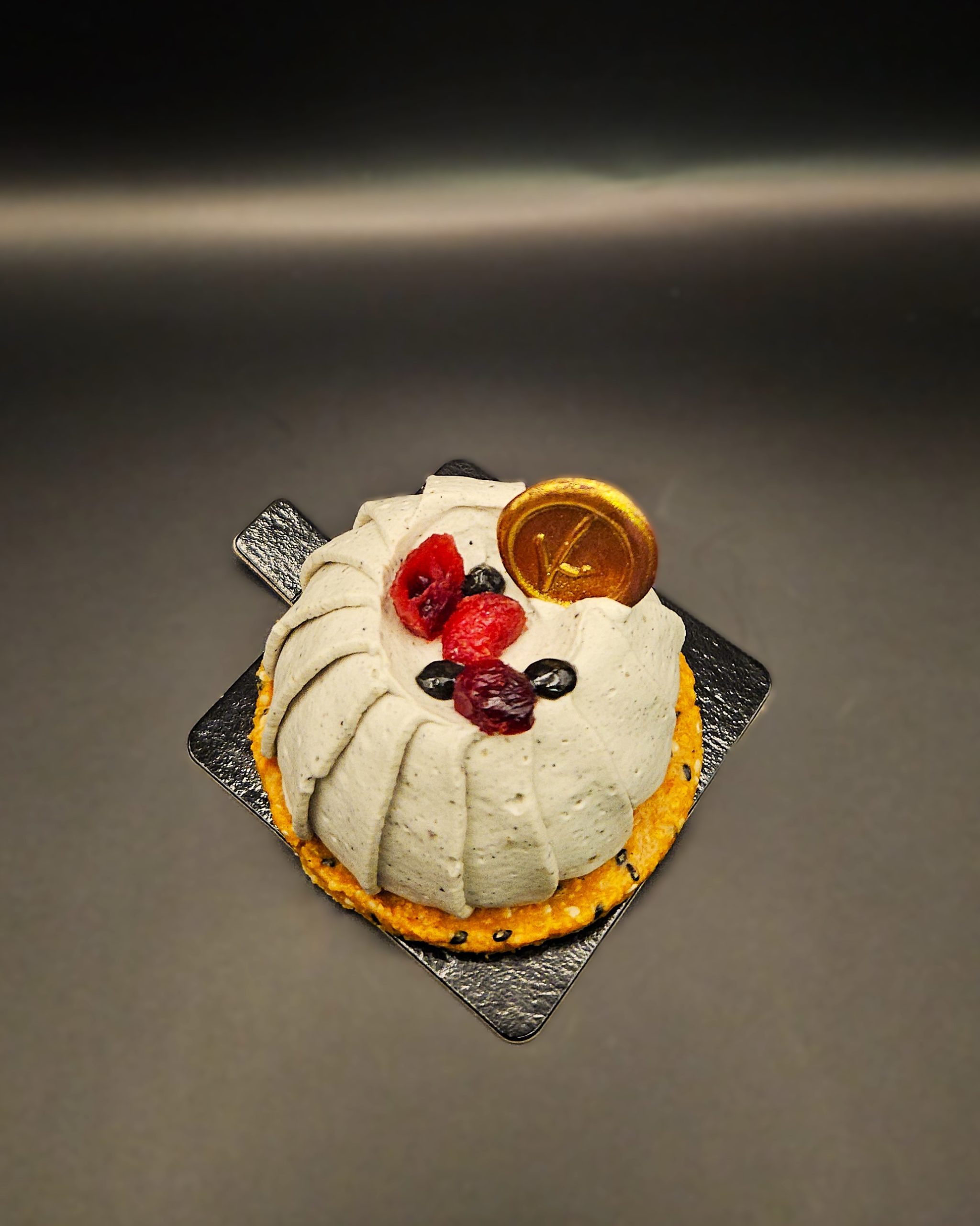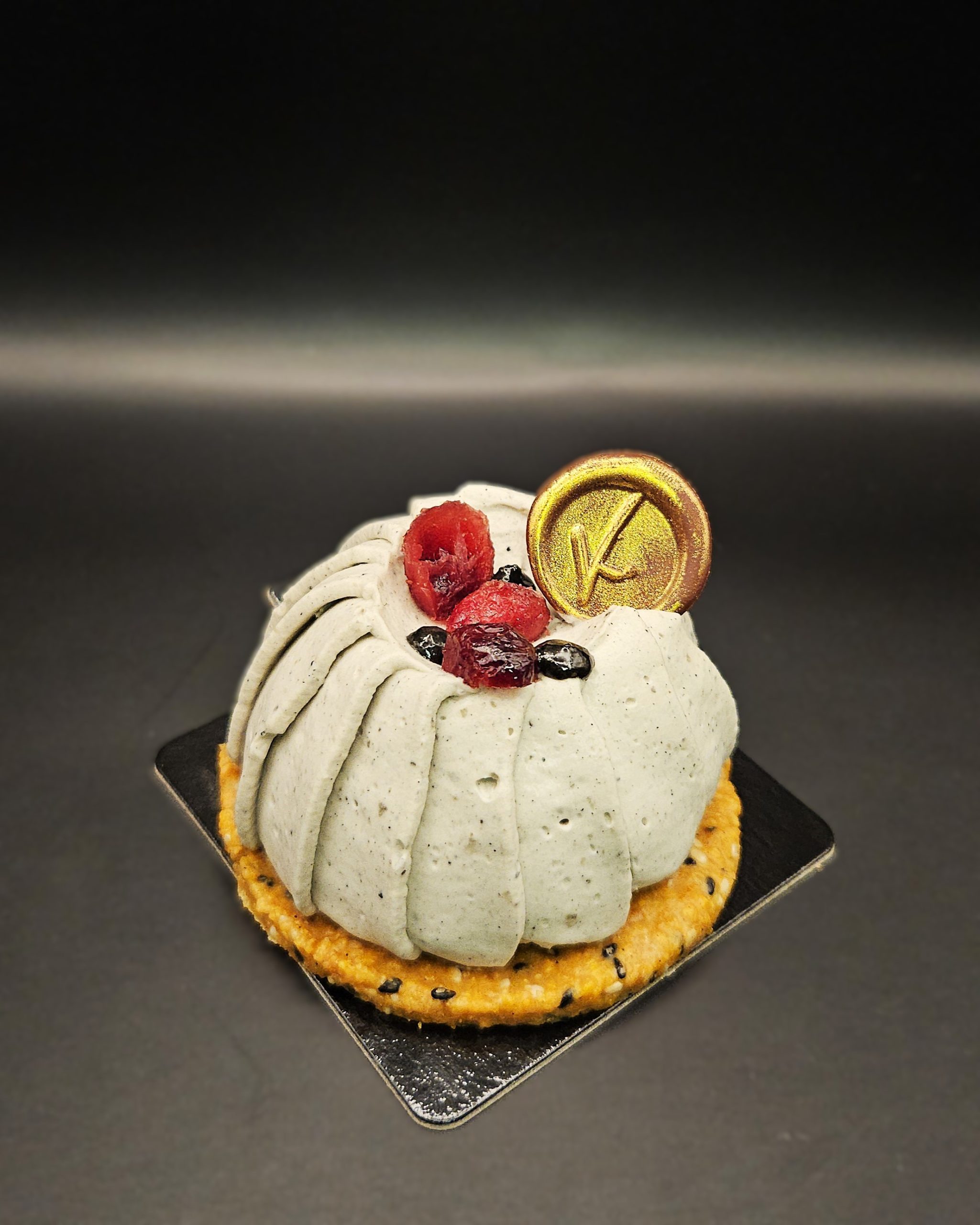 Une compotée généreuse d’airelles, un biscuit moelleux sans farine au sésame et un croustillant praliné , sublimés par une crème légère et mousseuse au sésame noir.