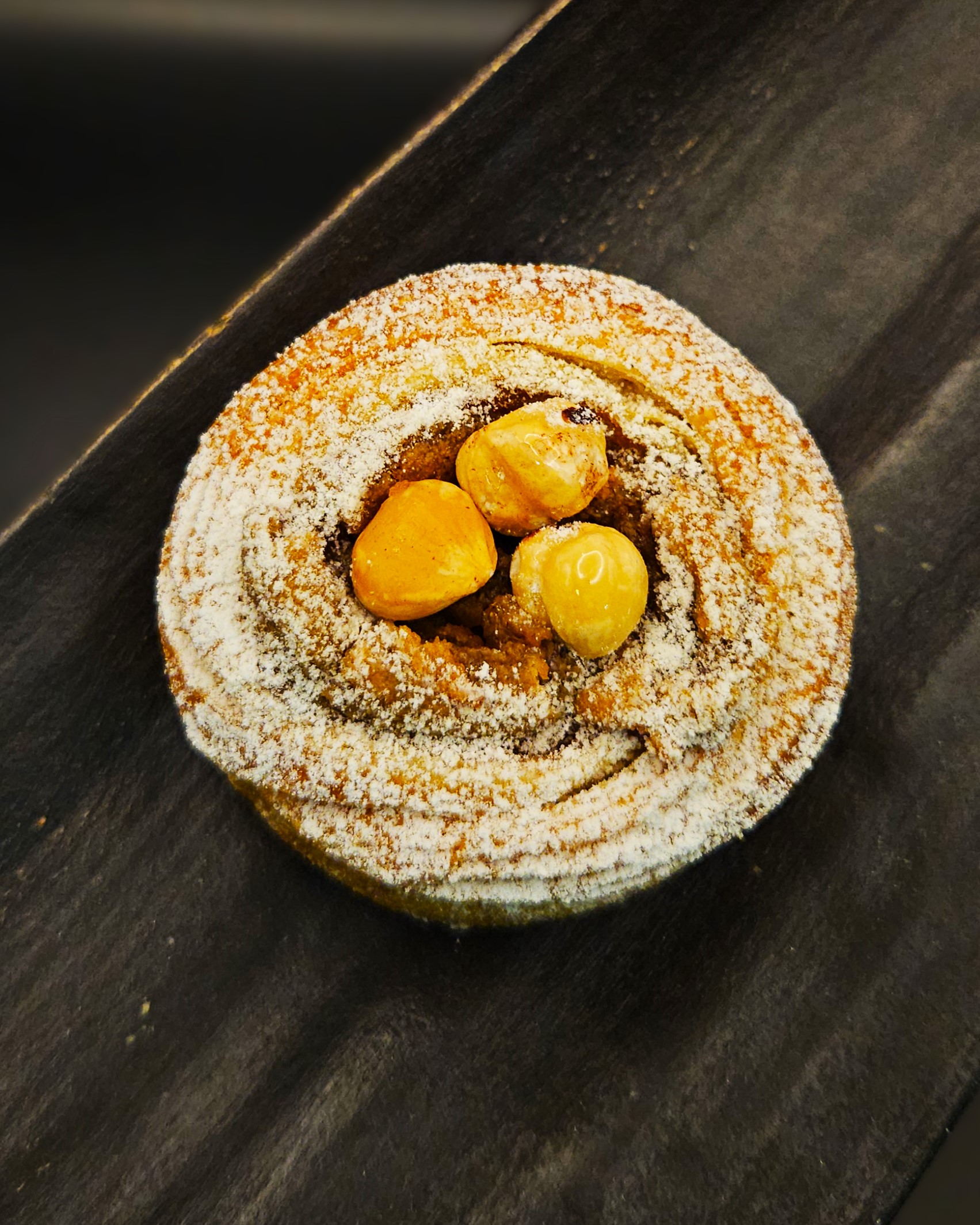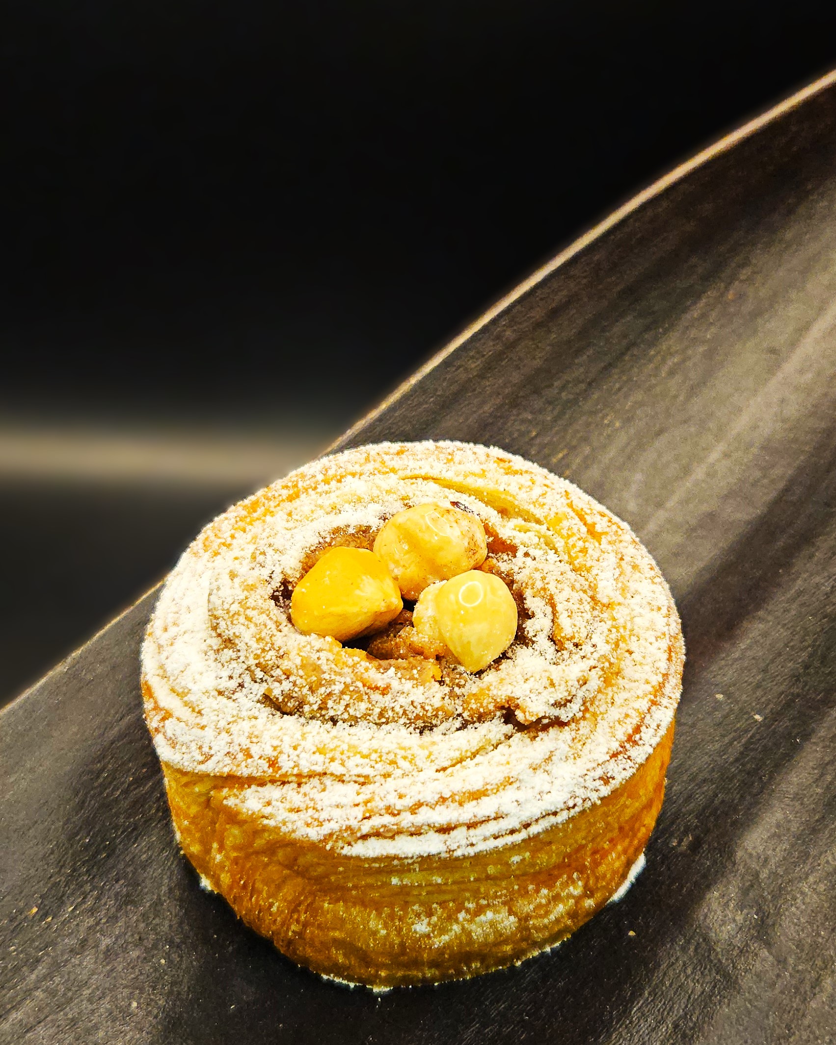Notre tourbillon varie avec la saison. Actuellement avec sa pâte danoise épicée à la cardamome, garnie d’un flanc aux noisettes d’Italie
